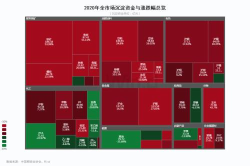2020年商品期货以及金融期货均有强劲表现。大商所铁矿石以54.06%涨幅位列涨幅榜第一,焦炭和焦煤以51%以及39.45%位于涨幅榜第二、第三名。