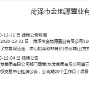 鲁网·泰山财经15日讯(记者 吴奕萱)今日,山东产权交易中心披露公告称,截至20201231日,水发集团有限公司旗下控股企业山东水发天源水务集团有限公司(简称“水发天源集团”)拟转让菏泽市金地源置业有限公司(简称“菏泽金地源置业”)51%国有股权及17709.655769万元债权项目挂牌公告期满。在公告期间,有1家意向受让方交纳了交易保证金,中心拟采取非竞价(协议转让)方式组织进行交易。