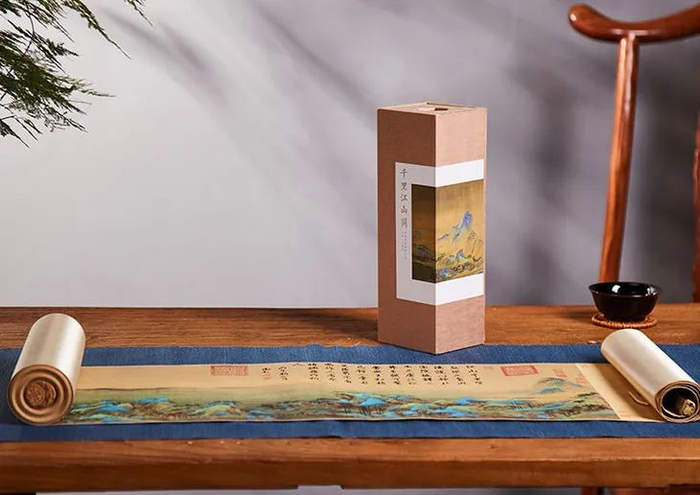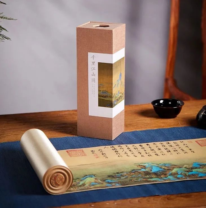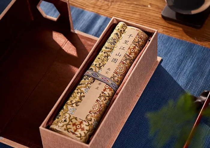 外包装上,使用了高档宋锦锦盒,质感坚实,既可以防虫,又可以很好地保护画作。
