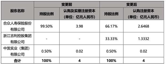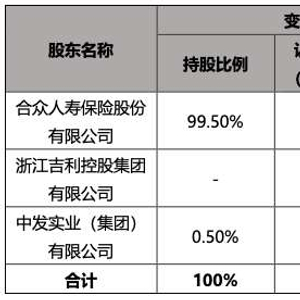 据公告,目前,合众财险有两家股东,分别为合众人寿和中发实业,持股比例为99.5%和0.5%。若此次股权变更获批,合众财险的股东及持股情况也发生变化:合众人寿持股66.17%、吉利控股持股33.33%、中发实业持股0.5%。值得注意的是,吉利控股33.33%的持股比例,也达到《保险公司股权管理办法》中规定的单一股东持股比例上限。
