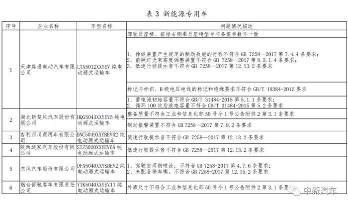 新能源专用车共涉及6家企业的6个车型产品,其中动力电池容量、报警信号、低速行驶提示音、标志标识等项目不符合国家标准或管理规定。相关企业包括天津路通、新楚风、吉利、通家、东风、舒驰等。