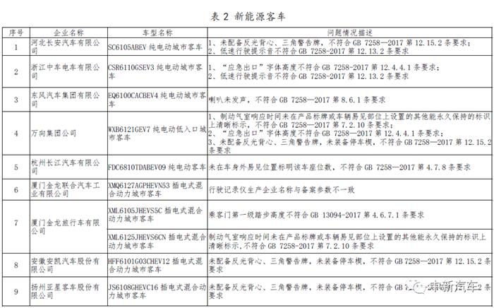 新能源客车共涉及10家企业的12个车型产品,其中低速行驶提示音、车辆喇叭、三角警告牌、标志标识等项目不符合国家标准或管理规定。相关企业包括河北长安、中车、万向、东风、长江、厦门金龙安凯、厦门金旅、亚星等。