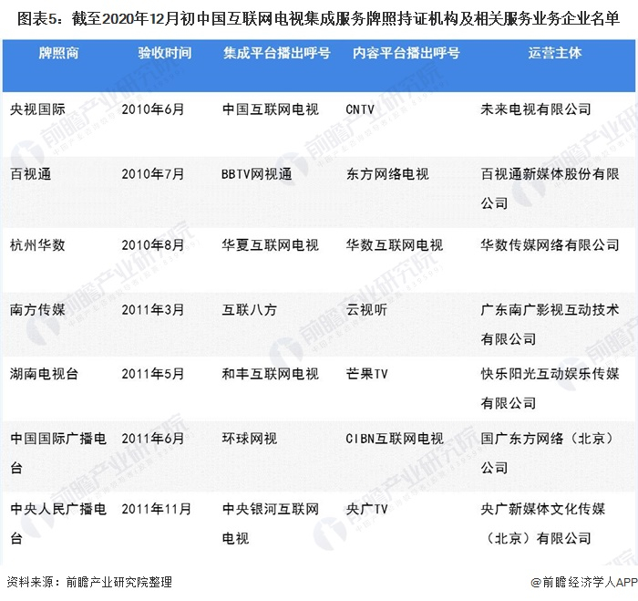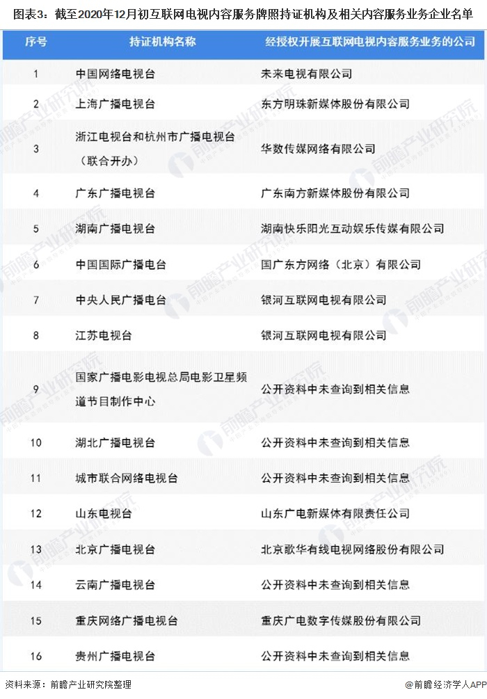 在互联网行业实际运行中,一些牌照持有方授权其控制的企业运营相关业务平台。截至2020年12月初,互联网电视内容服务牌照持证机构及经授权经营互联网电视内容服务业务企业名单如下: