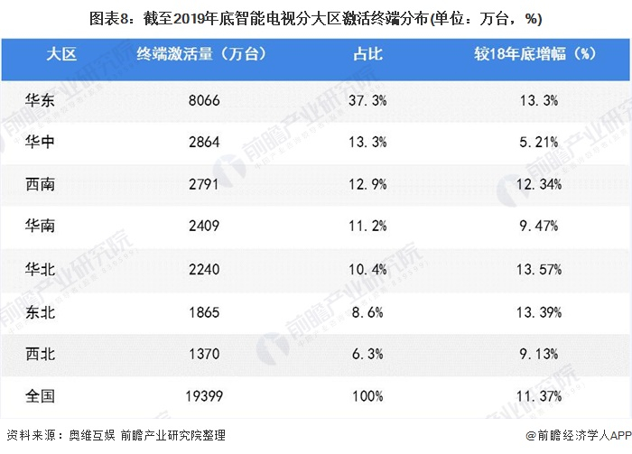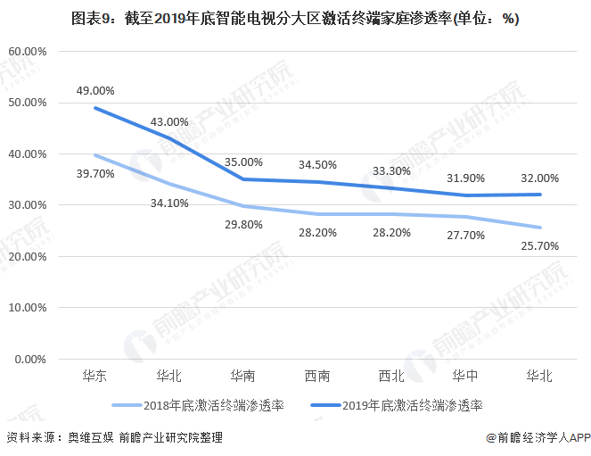 截至2019年12月底,智能电视激活终端仍重点分布在华东区域,华东区智能电视激活终端规模达8066万台,占比37.3%。继华中、西南、华南大区后,华北大区规模首度突破2000万台。其中华北、东北、华东大区表现出高增长态势。从渗透率看,华东区智能电视渗透率达49.0%,稳居第一。2019年所有大区渗透率均突破30%。