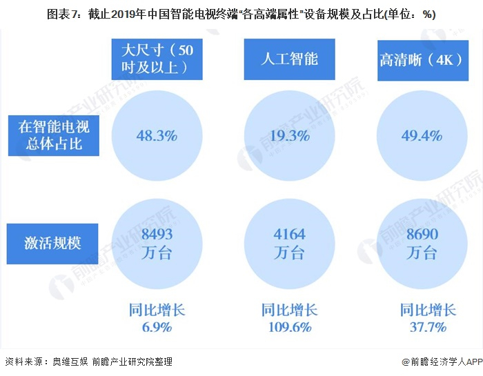 高清晰度(UHD 4K)的智能电视激活数量达到8690万台,较2018年增长37.7%,占智能电视终端激活数量的49.4%。
