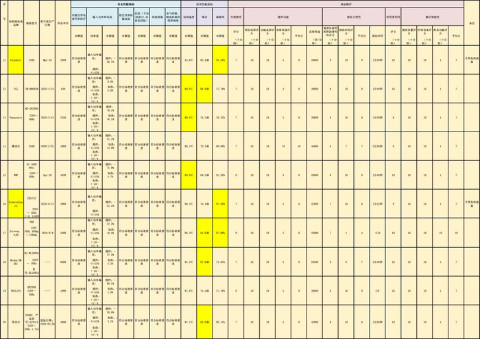 安全性能指标反映了产品使用过程中的安全,本次比较试验对样品触及带电部件的防护、输入功率和电流等6个项目进行检测,结果显示20款样品均满足国家相关标准项目要求。