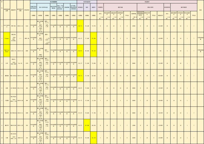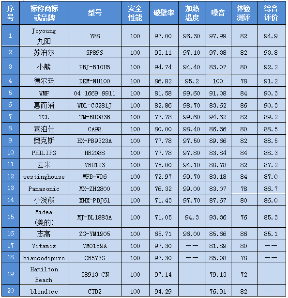 对本次20款样品进行综合评比,按安全性能30%、使用性能50%(破壁率30%、加热温度10%、噪音10%)、体验测评20%分配权重,得出破壁机综合评价表发现,九阳、苏泊尔、小熊综合表现较好。