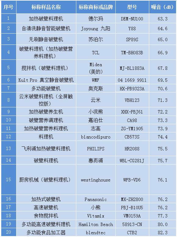 但目前国家标准尚未对破壁机的噪音限值进行规定,参照上述标准中吸油烟机的噪音限值73dB,本次试验结果显示有9款样品噪音在73dB以下。