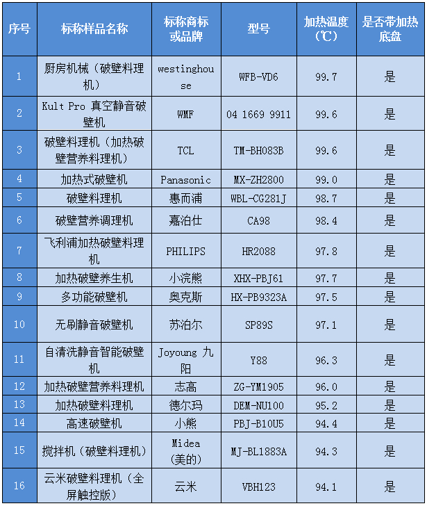 本次试验共有16款破壁机带有加热底盘,具有豆浆制作功能,试验结果显示,16款样品按搅打、加热程序制作完成后豆浆温度均超过90℃,通过此项测试。