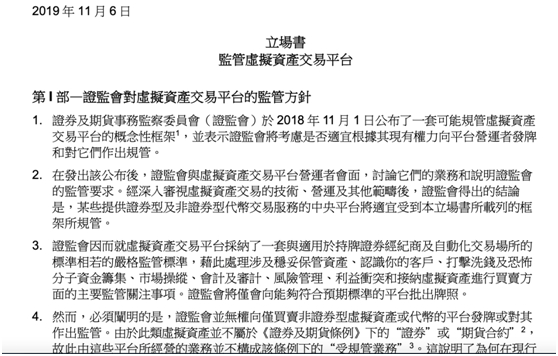 去年11月6日,香港证监会曾发布《有关虚拟资产期货合约的警告》和《立场书:监管虚拟资产交易平台》(简称“立场书”),表示将向符合《证券及期货条例》所界定的从事属于受监管活动的主体审批和颁发牌照。