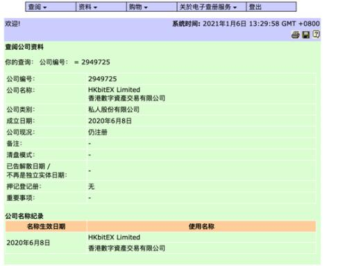 据了解,HKbitEX成立于2020年6月8日,是首批申请香港证监会“虚拟资产交易平台牌照”的机构之一。HKbitEX网站介绍,公司总部位于香港,主要为专业投资者提供电子资产的现货及场外交易,专注于虚拟资产交易所业务。去年4月取得信托和公司服务提供商牌照(TCSP LICENSE)。