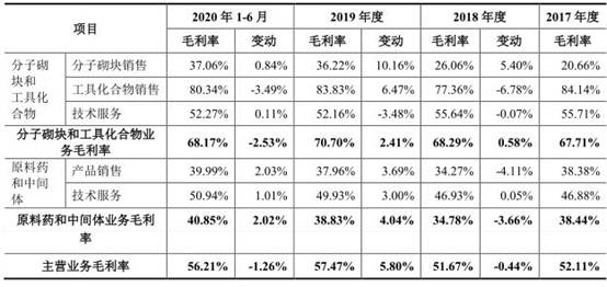 2017年至2020年1-6月,皓元医药主营业务毛利率分别为52.11%、51.67%、57.47%和56.21%,2019年比2018年上升5.80%,主要原因系高毛利率的分子砌块和工具化合物产品销售收入增长较快所致。