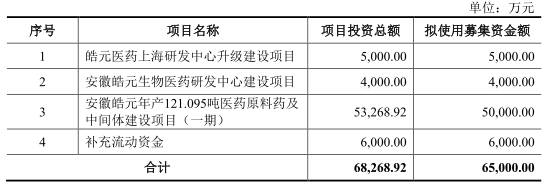 皓元医药拟于上交所科创板上市,计划公开发行股票不超过1860万股,拟募集资金6.50亿元,其中5000万元用于皓元医药上海研发中心升级建设项目、4000万元用于安徽皓元生物医药研发中心建设项目、5亿元用于安徽皓元年产121.095吨医药原料药及中间体建设项目(一期)、6000万元补充流动资金。