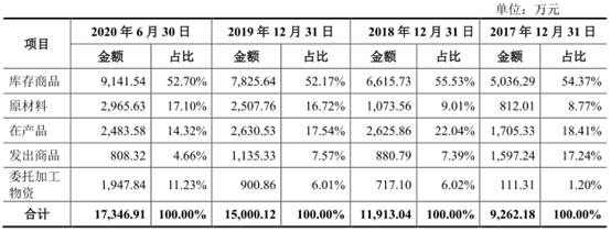 2017年至2020年6月30日,皓元医药存货金额分别为9262.18万元、1.19亿元、1.50亿元和1.73亿元,占公司资产总额的比例分别为48.32%、39.13%、27.65%和27.64%,占公司流动资产的比例分别为53.55%、46.99%和35.29%和36.20%。