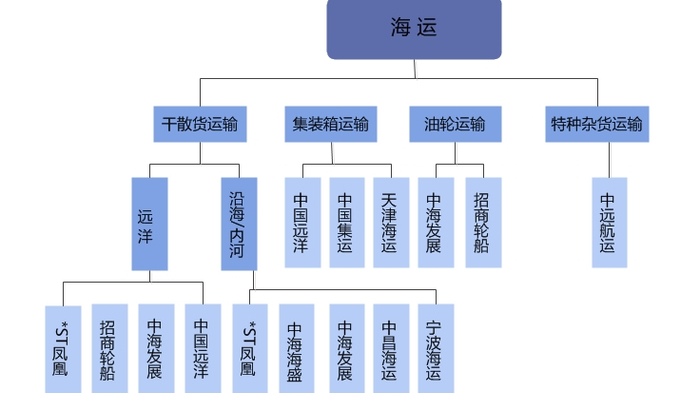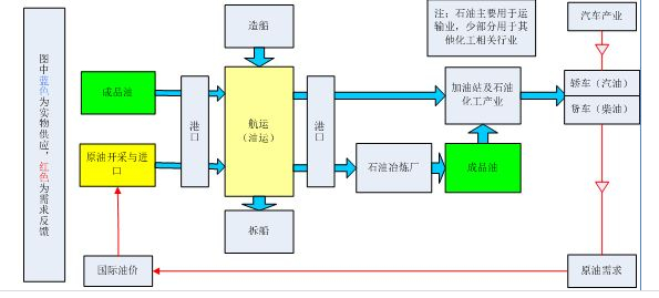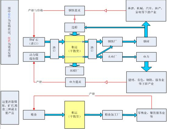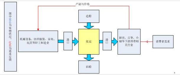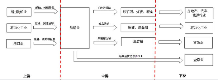 海运业上游是造(修)船、港口码头等基础供应产业,下游服务钢铁、房地产等国民经济基础行业。海运业根据运输货物的不同,主要划分为干散货运输、油品运输和集装箱运输等。整条产业链的传导作用自下而上,即下游的运输需求会拉动海运的繁荣兴衰,上游造船业供应的较长周期,会加大行业供需错配的矛盾,引起周期的较为剧烈波动。近年来,随着企业越来越多的采用远期运费协议(FFA)等衍生工具来进行套期保值,海运业与金融业的联系也越来越紧密。