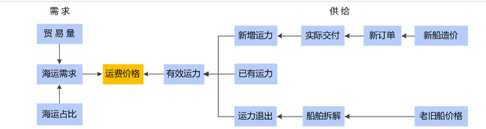 海运业分析的立足点是供需关系分析。海运业作为一个全球性的竞争行业,需求主要为全球的干散货、油品、集装箱等的贸易量,供给主要为全球的船舶运力。需求与供给的博弈,最终传导至价格,成为影响盈利变动的核心因素。