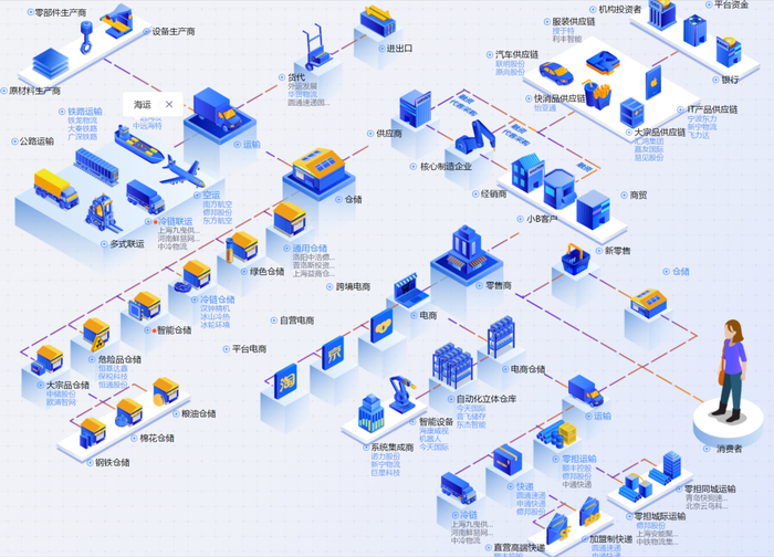 集装箱航运的产业链结构比较简单,但涉及物资比较复杂。运输的货物中占比最高的是机械设备、纺织服装、家电与玩具。由于运输的基本都是成品,相关联的下游行业多为销售类行业。