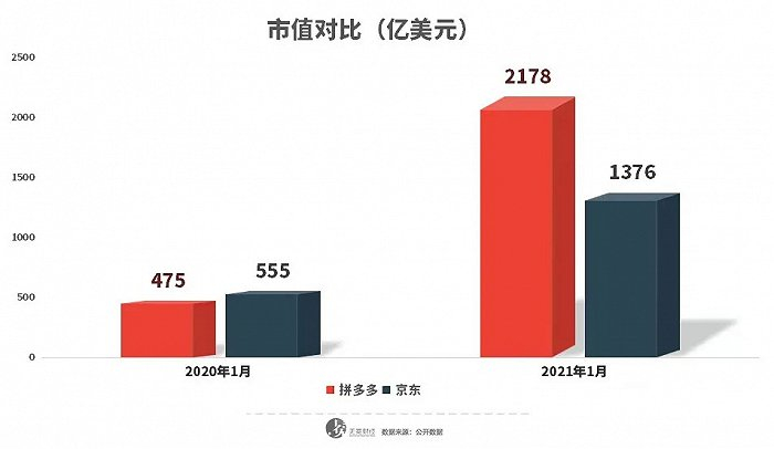 京东最近几年进步有目共睹,但拼多多跑得更快,活跃买家数早就超过京东。一年前,拼多多市值比京东少80亿美元;截至1月3日,拼多多市值领先京东800亿美元,坐稳电商第二把交椅,而这正是徐雷的“一亩三分地”。