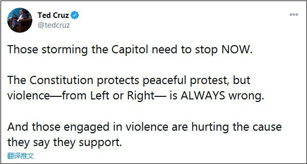 但是,随着后来特朗普支持者冲击国会大厦,克鲁兹在推特上谴责称:“那些冲击国会大厦的人现在需要停止。宪法保护和平抗议,但是暴力,不管是来自左翼还是右翼,都是错误的。那些参与暴力的人,正在伤害他们声称支持的事业。”