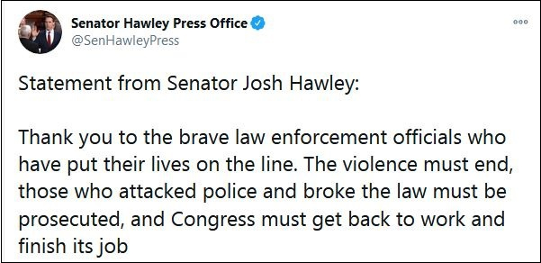 密苏里州共和党参议员乔什·霍利(Josh Hawley)在6日下午的一份声明中对执法部门表示感谢,并呼吁结束暴力。“国会必须重新开始工作,完成它的工作。”