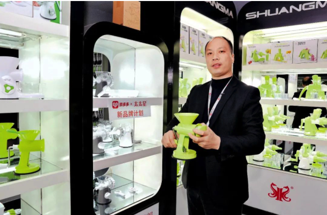 双马塑业集团常务副总经理杨文军手持的绞肉机,是与拼多多合作的最新定制化产品。来源:被访者