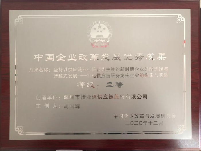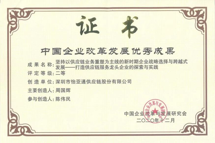2020年12月29日,由中国企业改革与发展研究会主办的“2020中国企业改革发展峰会暨成果发布会”在京举行,怡亚通《以供应链业务重塑为主线的新时期企业战略选择与跨越式发展》案例荣获中国企业改革与发展研究会“2020中国企业改革发展优秀成果”二等奖,并入选成果报告的“战略管理、双循环发展及商业模式创新”章节内容,为传统企业转型变革及供应链创新提供了新的发展思路。