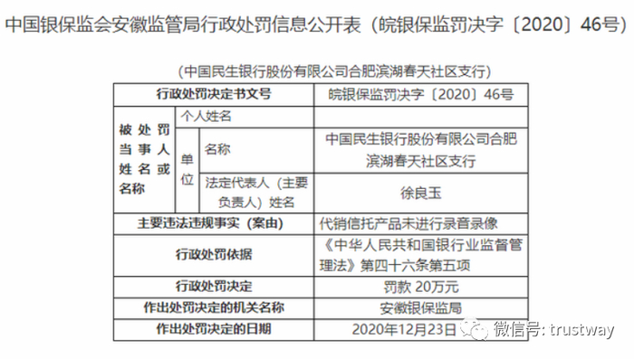 银保监会网站日前公布的行政处罚信息公开表显示,民生银行合肥滨湖春天社区支行存在代销信托产品未进行录音录像的违法违规行为。根据《中华人民共和国银行业监督管理法》第四十六条第五项,安徽银保监局对其罚款 20万元。