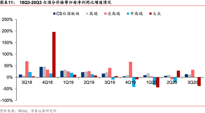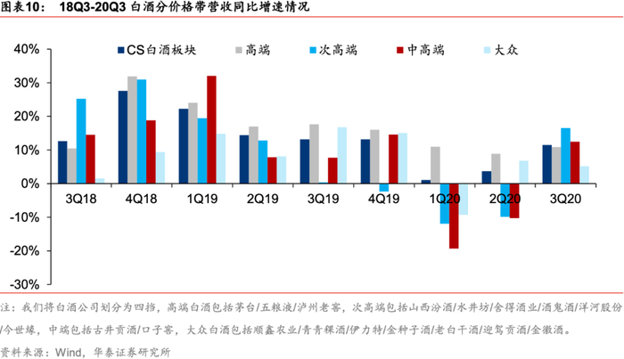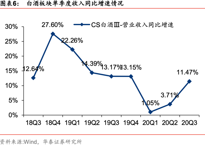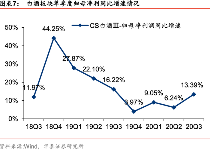 短期业绩展望:20年三季报确认需求加速恢复,从恢复节奏看,20Q3-21Q2四个季度逐季改善的前景是比较明朗的,白酒板块步入业绩驱动期。20Q2终端动销虽有复苏,部分白酒企业控货稳价以帮助经销商消化库存,营收并未出现较高增长,但轻装上阵为后续增长打好基础,Q3以来宴席/餐饮/送礼复苏推动中秋国庆前白酒消费需求增长较快,动销和渠道库存良性,CS白酒板块20Q3营业收入/归母净利润617.5/212.4亿元,同比增长11.5%/13.4%,增速环比20Q2分别大幅提升7.8/7.2pct,我们预计在21Q1(假定疫情不反弹)春节旺季有望延续中秋国庆旺季的表现(出国不畅通、假期集中、国内刺激消费),叠加低基数效应,21H1白酒业绩弹性较高,看好白酒板块业绩逐季改善,有望对当前板块估值形成支撑。