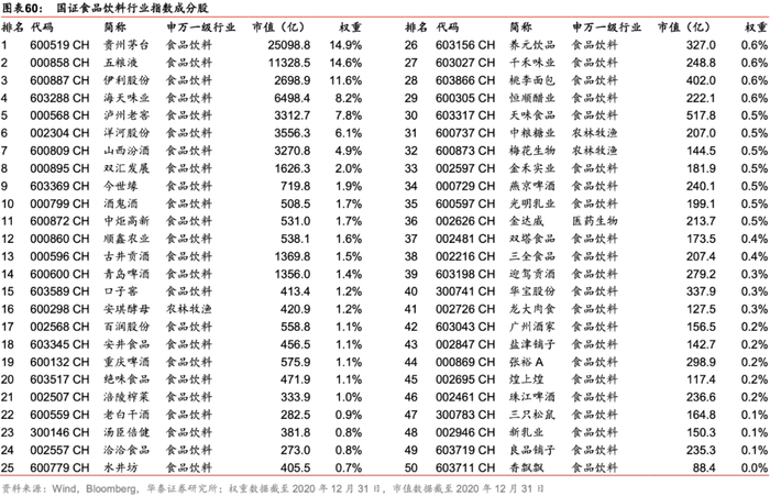 国证食品饮料行业指数于2020年12月14日进行成分股定期调整。截至2020年12月31日的成分股、对应申万一级行业、总市值及权重如下表所示。由于单只成份股权重上限15%的限制,贵州茅台和五粮液这两只市值超万亿股票的权重占比和伊利股份接近,避免权重过度集中在少数个股。