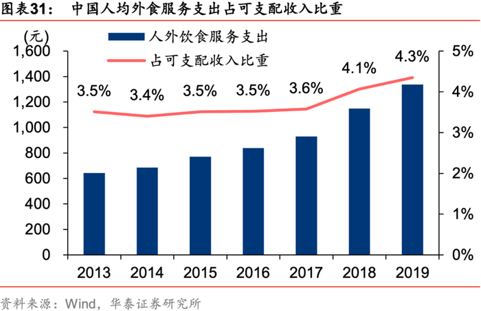 疫情后餐饮渠道需求逐步恢复。根据调味品行业协会,调味品渠道结构按照服务终端主要分为餐饮渠道、零售渠道和食品工业渠道,19年收入占比分别为45%、30%、25%,餐饮渠道已经成为调味品消费的主要渠道。19年中国人均外食的消费额占人均可支配收入的4.3%,外出就餐消费额的增加使得我国餐饮行业保持快速增长态势(根据国家统计局,15-19年我国餐饮行业收入CAGR为11%)。疫情对调味品B端餐饮带来冲击,随着疫情好转,餐饮行业处于恢复过程中,限额以上企业餐饮收入同比增速自20年10月开始转正,我们预计21年餐饮行业有望逐步恢复至正常状态,将为调味品餐饮渠道消费贡献增量。
