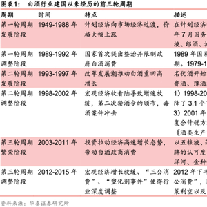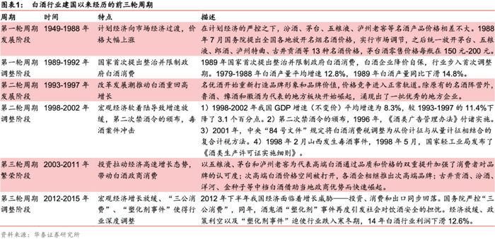建国以来白酒行业经历了三起三落,第一轮(1949-1992):从管控到放开定价权,禁酒令促使首轮调整;第二轮(1993-2002):经济高增刺激名酒需求,多因素触发二次调整;第三轮(2003-2015):黄金十年“渠道为王”,政策利空迫使行业跌入寒冬。