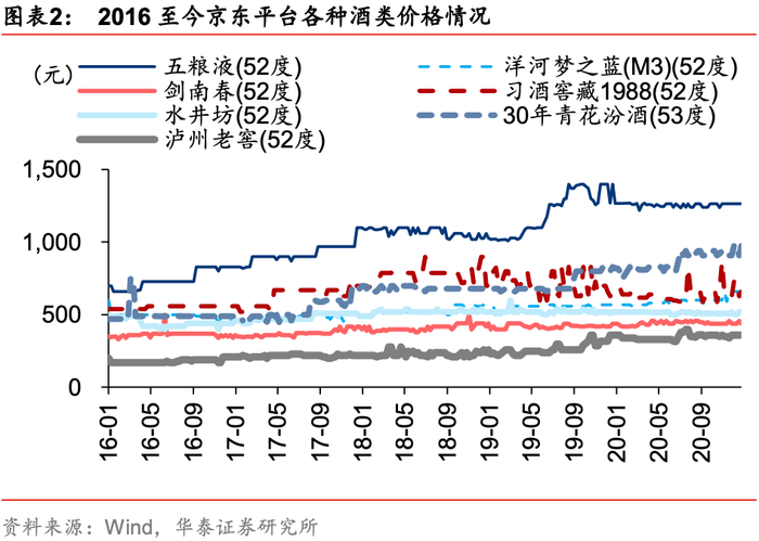 2016年至今,白酒行业处于建国以来的第四轮周期:渠道利润与库存循环良性,行业周期性弱化。2016年至今,居民收入快速增长带动消费能力的提升,白酒消费向头部集中的趋势愈加明显,龙头企业议价能力提高,产品价格护城河不断加强,产品价格也逐渐提升。根据京东平台显示的产品价格,五粮液(普五)、洋河梦之蓝(M3)、剑南春(水晶剑)、水井坊(井台)、习酒窖藏1988、30年青花汾酒、泸州老窖等产品每年都有不同程度的上涨。我们认为,厂家在经历以上几轮周期并吸取经验之后,控货稳价意愿及能力显著提升,走出前三轮价格上涨-消费挤出、厂家放量-量价崩塌的恶性循环。另外白酒产品提价预期愈演越烈,渠道利润增厚、经销商备货和打款积极性提高,消费者对高端白酒囤货意愿也逐渐提升,在可控范围内渠道主动吸收库存,相较于前三轮周期中供增需减-库存高企-价格崩塌导致行业下行,此轮周期波动性得到平滑。