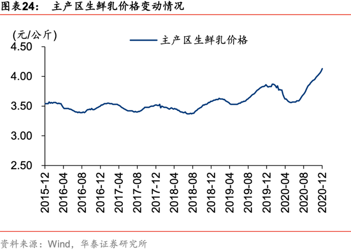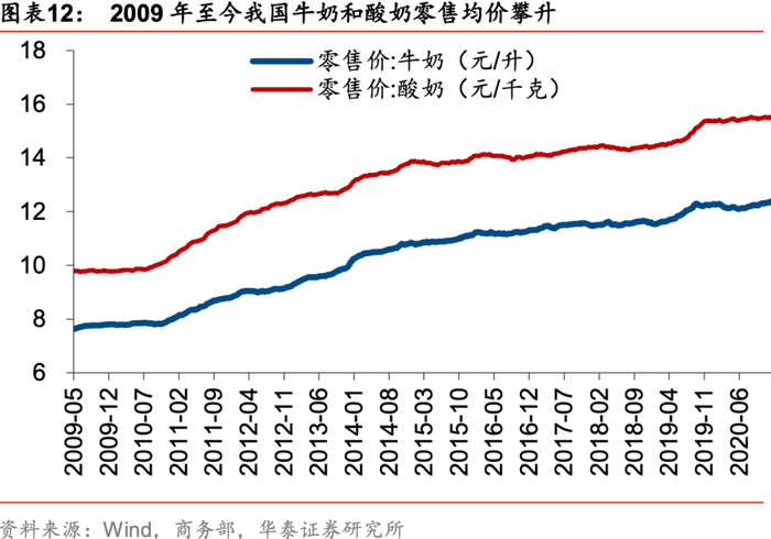 1)子类产品均价稳步提升。根据商务部数据,我国牛奶和酸奶的零售均价明显攀升,其中牛奶从2009年5月初的7.63元/升提高至2020年底的12.39元/升,酸奶则从2009年5月初的9.80元/千克稳步提升至2020年底的15.56元/千克;