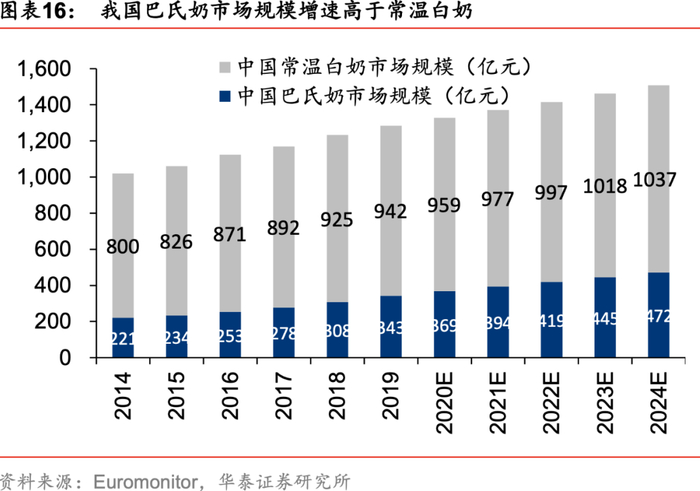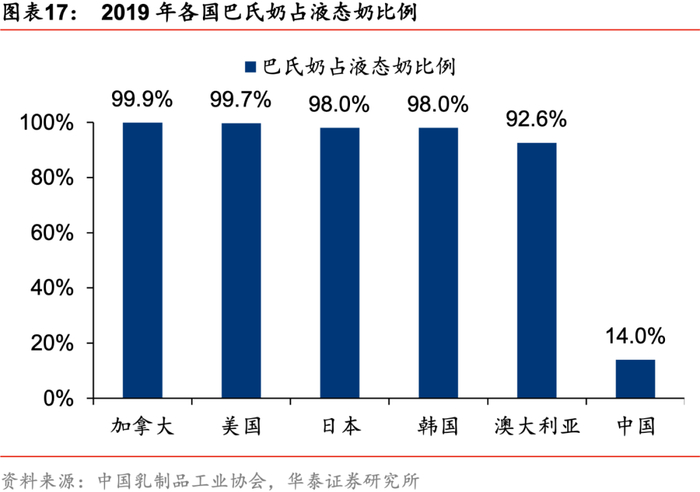 中长期看,低温奶迎来发展窗口期,巴氏奶在白奶中占比有提升空间较大。受奶源分布不均衡、冷链技术受限、环境承载力等因素影响,目前常温奶占据了我国乳业市场的绝大部分份额。伴随国内外乳企消费者教育的不断普及,消费者健康化意识逐步增强,叠加冷链物流系统的不断完善,我国巴氏鲜奶近年来呈现较快增长态势,2019年市场规模达343亿元。根据Euromonitor,我国巴氏奶市场规模增速高于常温白奶,预计2020-2024年有望保持6%左右的复合增速。目前我国巴氏奶的发展仍处于初级阶段,2019年其在液态奶中的产业占比仅为14%,相较于加拿大(99.9%)、美国(99.7%)、日本(98.0%)等发达国家仍有较大提升空间。