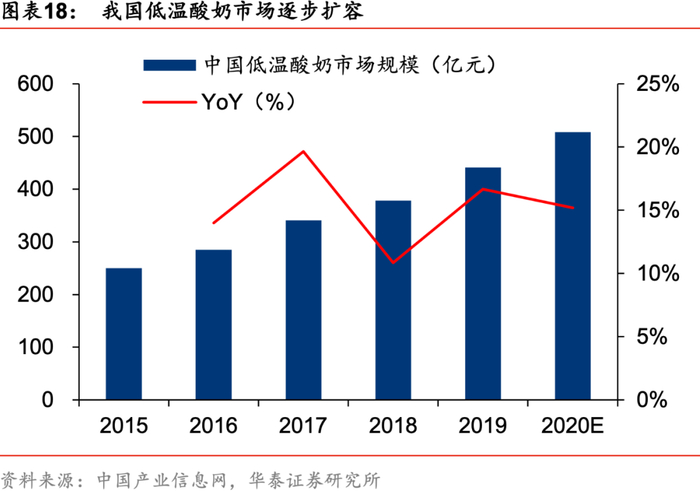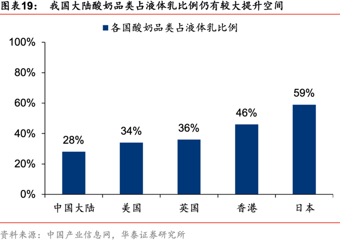 酸奶满足健康化、休闲化消费趋势,契合多元化消费场景。随着居民消费水平的不断提高,消费者对健康越来越重视,酸奶作为富含膳食纤维促进肠道蠕动的功能性乳饮,受到了广大消费者的欢迎,成功晋升我国乳液增长较快的品类。由于乳企在酸奶品类上不断创新,大力开拓消费场景提升消费频率,休闲化趋势将成为酸奶未来持续高增长的另一核心驱动力。根据中国产业信息网统计,我国低温酸奶近年成长迅速,低温酸奶2019年市场规模达441亿元,预计20年有望达508亿,16-20年复合增速达15%。目前我国酸奶品类占液体乳比例仅有28%,相较于美国(34%)、英国(36%)、中国香港(46%)、日本(59%)仍有较大提升空间,未来伴随着下沉市场的不断深耕,低温酸奶的需求将进一步被挖掘。