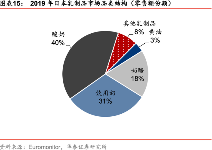 对标日本市场:未来我国乳制品结构有望更加均衡。根据Euromonitor数据,我国乳制品(不含婴幼儿奶粉)品类结构相对集中,主要以饮用奶(62.1%)为主导;但日本市场品类分布更为均衡,酸奶(39.6%),饮用奶(31.3%)、奶酪(17.8%)品类均占据重要市场。我国消费者的饮食习惯与口味偏好与日本较为相似,因此我们认为后续我国乳制品市场的消费结构有望向日本倾斜,未来我国乳制品的消费结构有望更加均衡,酸奶、奶酪等其他品类收入贡献或继续提升。
