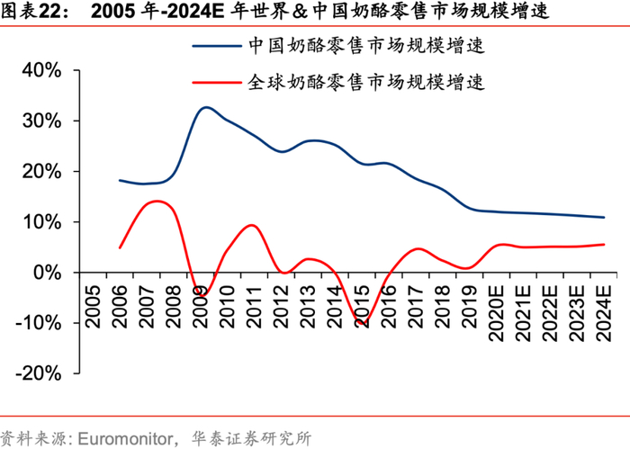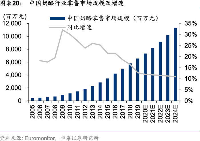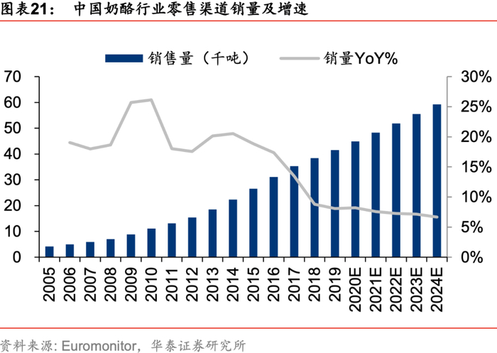 奶酪位于乳业消费金字塔的顶端,营养价值高,伴随着物流仓储等基础条件提升和消费习惯培育,在消费升级中迎来快速发展阶段。根据《2019-2028年中国奶制品市场展望报告》,95后成为新的消费群体,此类人群对于干奶制品需求量增长较快,同时家庭烘焙也逐渐兴起,奶酪、黄油等消费量将迎来持续较高增长的契机,且儿童奶酪应用场景逐步清晰。根据Euromonitor的数据,2019年我国零售奶酪终端市场规模约65.5亿元,2010-2019年复合增速达到22%,预计2024年将达到112亿元,预计2020-2024年年均复合增速12%。2019年我国零售奶酪终端销量4.15万吨,2010-2019年复合增速达到17%,预计2024将达到5.92万吨,预计2020-2024年年均复合增速7%,销售额增速高于销量增速,即表明在销量快速增长的同时保持价格的同步提升。
