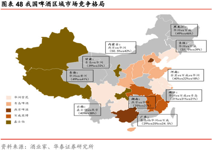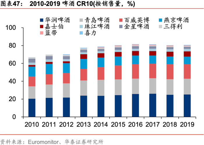 整合并购潮后头部格局基本稳定,短期疫情助推集中度提升。在行业扩产期,小企业由于环保、税收、成本弱势等因素退出行业或被龙头归并,目前头部企业通过收购基本完成产能及市场布局,寡头垄断格局形成,华润/青岛/百威稳居行业前三,19年市占率分别为25.2%/17.6% /16.3%,较2010年分别提升4.8/3.8/5.3pct,13年以来CR10基本稳定在80%,行业格局基本稳定;从区域市场看,龙头跑马圈地已近尾声,局部均衡基本形成。头部企业在全国跑马圈地,搭建起各自的优势市场,华润啤酒(辽/川/贵/皖/苏)、青岛啤酒(鲁/沪/琼/冀/晋/陕)、燕京啤酒(京/桂)及百威、嘉士伯立足优势市场,发挥产能、品牌、渠道等独有优势,主导区域啤酒消费,黑/吉/内/青等虽无绝对龙头,但亦形成双寡头或三寡头格局,局部基本实现均衡。新冠疫情下中小企业生产恢复较慢,啤酒龙头产能布局全国且渠道较为完善,疫情期间韧性凸显,收入及利润表现均优于行业整体,预计市场份额将继续扩大,行业竞争进一步内化为龙头间的较量。
