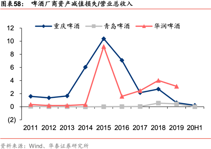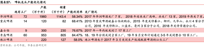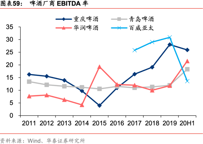重啤率先开启产能优化进程,龙头相继进入利润释期。产能优化尤其是关厂涉及职工安置等民生问题,在经济下行期间国内啤酒厂家关厂阻力较大,重啤由外资控股,体制机制较为灵活,15年率先关闭4家分子公司开启产能优化进程,16年吨折旧/资产减值损失率同比-10%/-3.3pct),EBITDA率同比+7pct且在随后年份维持高位。借鉴重啤经验,华润、青岛、珠江等啤酒厂家于17-18年开启产能优化进程,产能利用率处于稳健的上升通道, 19年华润/青岛啤酒EBITDA率同比+1.8/0.6pct,随着职工安置、存货等资产处置进程结束,20H1华润/青岛啤酒EBITDA率同比+2.8/+2.6pct,预计21年将继续释放盈利弹性。