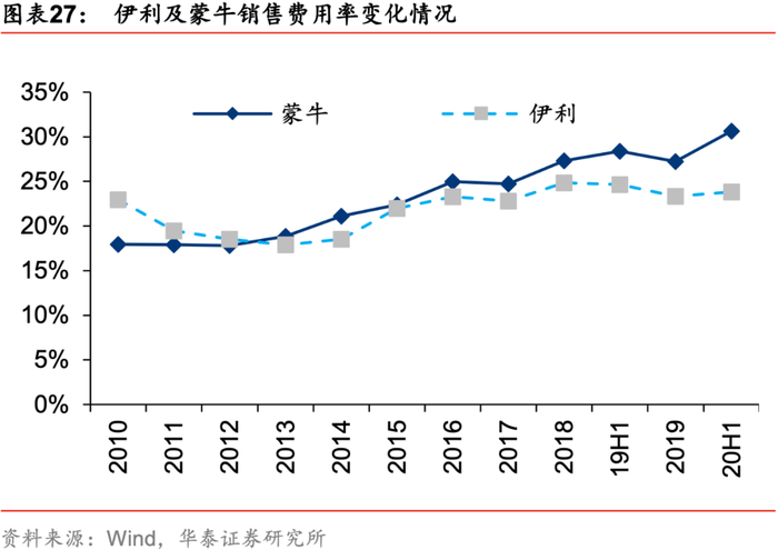双寡头格局稳定。伊利和蒙牛作为全国性乳制品龙头19年分别实现收入900/790亿元,在乳制品大行业中市占率分别达25.1%/20.7%,同第三名光明拉开数倍差距。乳业双雄竞争趋缓,销售费用率呈下行趋势,费用投放的边际效益将逐步递减。伊利蒙牛近年来稳步增长的销售费用投放奠定了其稳固的市场地位。但随着未来行业步入稳定发展期,费用投放的边际效益将逐步递减。19Q2伴随着渠道库存清理的逐步完成,伊利及蒙牛的促销力度明显减弱,2019年伊利和蒙牛销售费用率分别同比下降1.5pct和0.1pct。2020H1蒙牛为尽快降低渠道库存投入额外营销费用,销售费用率为30.6%(同比+2.2pct),伊利20H1销售费用率为23.8%(同比-0.8pct),其中主要因为广告营销费用率降至13%(同比-0.5pct)。我们预计在费用投放效益边际递减、原奶价格上涨压力的大背景下,未来乳企间的竞争将进一步趋缓。