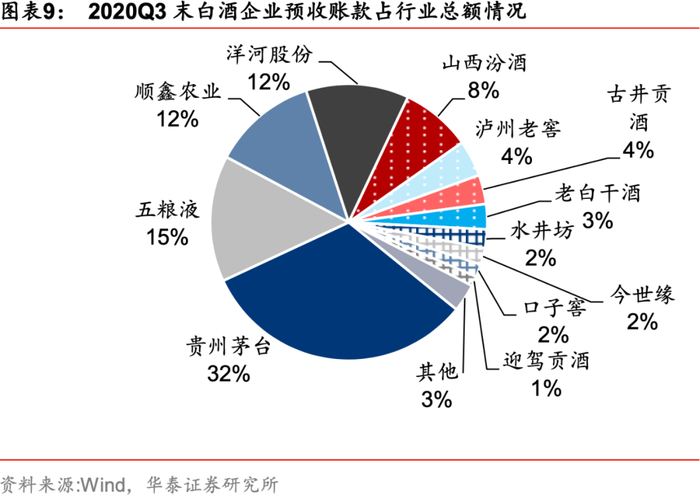 从预收款维度,20Q3末预收款(合同负债)环比转增,经销商打款意愿恢复,为未来收入增长奠定信心。2020Q3末白酒行业预收账款为327.6亿元,较2019年末下降33.7%,系20年春节提前,春节打款集中在19年末使得基数较大所致;预收款环比20Q2末增长11.1%,由于Q2期间大部分厂家为减轻经销商资金压力放缓打款节奏,Q3下游动销恢复,打款恢复。总体来看,大部分白酒企业20Q3预收账款环比20Q2末均有所回升。