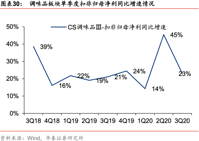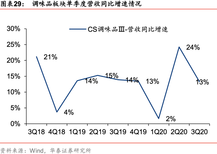 调味品20H1营收出现波动,20Q3恢复常态,龙头在此轮疫情中展现出更强抗风险能力。疫情对调味品B端餐饮带来冲击,20Q1调味品板块营收同比增速仅1.6%,疫情之下行业龙头和面向C端为主的调味品企业表现更优,龙头凭借较快的复工速度、健全的销售网络凸显优势,领先优势扩大;经历Q1疫情负面冲击及Q2行业龙头给予经销商资金支持、下游补库存强势反弹后,Q3调味品板块营收同比增速环比Q2有所放缓,主要系Q2有补库存等因素影响以及商超、流通、线上等渠道在经历Q2快速增长后需求有所回落,20Q3行业恢复常态,高端产品、具备较大渗透率提升空间的复合调味料及新兴品类增长较快。