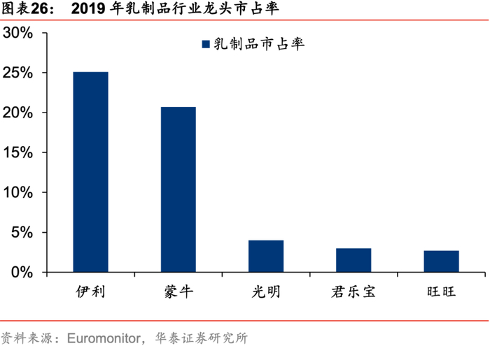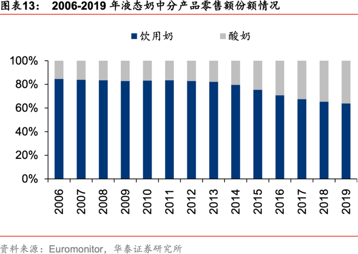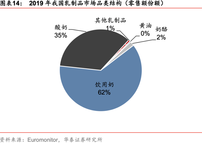 2)乳制品品类结构持续优化。液态乳主要包括饮用奶和酸奶,其中饮用奶含鲜奶和UHT奶等,酸奶为酸奶和酸奶饮料。近年来易吸收、助消化的酸奶消费步入快速上升通道,根据Euromonitor统计数据显示,2017-2019年期间我国酸奶零售额复合增速达12.5%,表现明显优于饮用奶(CAGR仅1.4%),至19年酸奶在液态奶中的零售额份额提升至36.2%,且预计凭借健康属性与丰富的产品可拓空间,其占比仍将持续提升。