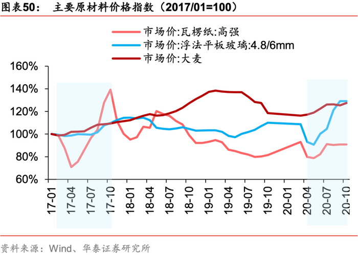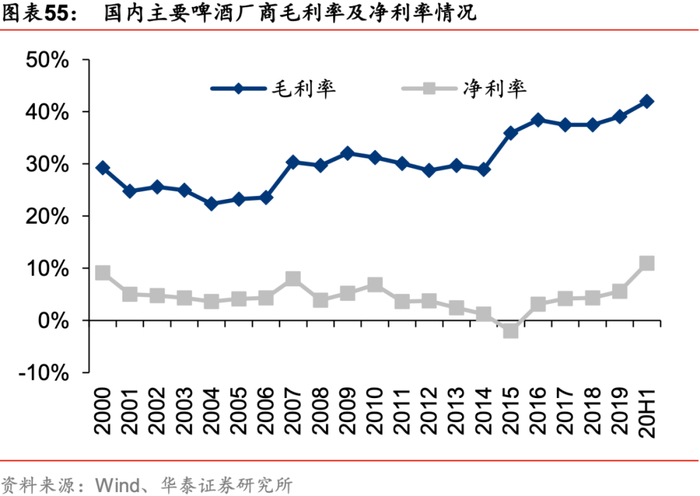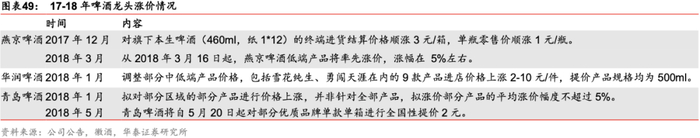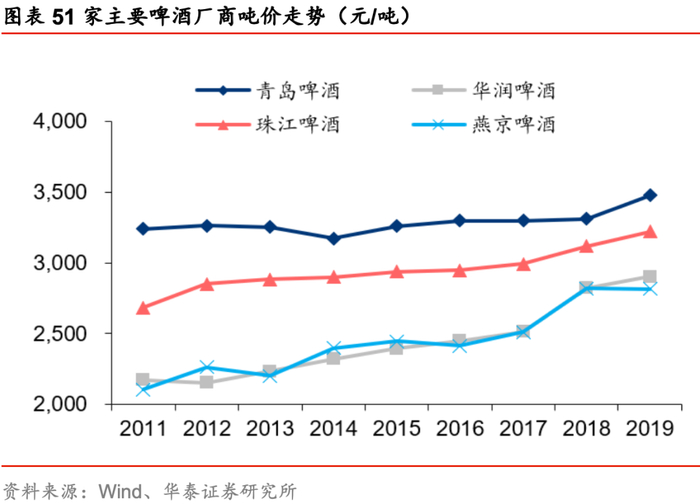 5月起主要原材料价格上涨,行业涨价潮可期。据青岛啤酒19年年报,在啤酒生产成本中包材/酿酒原材料占比达51%/25%,在酿酒原材料中,麦芽占比高达83%,原材料价格对厂商定价及利润影响大。17-18年由于环保限产导致玻璃、纸装等包材价格上涨,主要啤酒厂家纷纷提价,时隔十年行业再迎涨价潮,而在行业增量有限、龙头市占率基本稳定的背景下,价格战意义不再,龙头定价权提升,4个主要啤酒产商(华润/青岛/燕京/珠江)2018-2019年吨成本同比+5.9%/-0.4%,吨价同比+6.3%/+3.6%,盈利能力改善。20年5月,由于澳麦“双反”,商务部决定自5月19日起对澳麦征税,反倾销税率73.6%,反补贴税率6.9%,根据Wind数据,5-10月份,国内大麦价格上涨7%,瓦楞纸价格及中国玻璃价格指数由于下游需求恢复价格呈V型反转,分别上涨15%/42%,成本上涨有望带动行业再迎涨价潮。