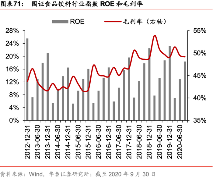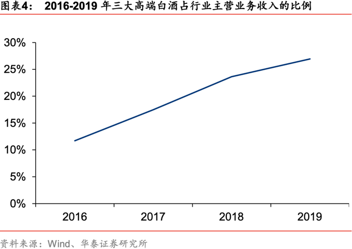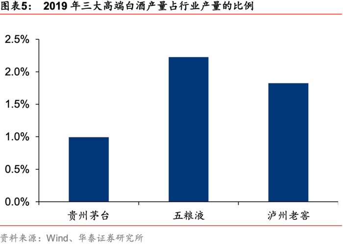 高端白酒:护城河俱坚实,马太效应显现。2016年,贵州茅台、五粮液、泸州老窖收入占全国规模以上白酒营业收入的11.7%,2019年三者收入占比提升至26.9%。从发展前景看,目前虽然集中度不断提升,但是高端白酒在行业中产量占比依然较小。2019年茅台、五粮液、泸州老窖的产量分别占全国规模以上白酒产量的1.0%、2.2%和1.8%。随着居民收入的不断提升和消费结构的升级,高端白酒未来发展空间较大。高端白酒利润高且规模持续扩容,部分白酒企业推出了高价产品以期进驻高端市场,但品牌力、产品力、渠道力等多重因素组成的高壁垒使得新进者很难短期内改变消费者认知,竞争格局较为稳定。