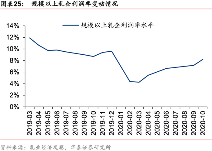 2)常温奶高端化发展趋势确定,满足人们健康需求。伴随着超高温灭菌工艺的不断进步,高端常温奶也能保留大量优质乳蛋白、原生钙等营养成分,充分满足消费者对于健康的需求。乳制品迈入消费升级品质时代,常温高端化仍将引领行业发展,产品结构优化有望带动提价增利。