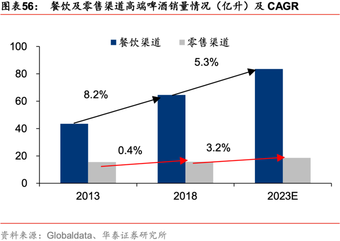 “产品+品牌+渠道”全方位蓄力高端,龙头有望步入收获期。1)产品+品牌:龙头内生+外延并举,通过自研及以获取品牌为目的的收购,搭建高端产品矩阵,通过多元营销手段打造高端品牌形象;2)渠道:据globaldata的数据,13-18年高端啤酒在餐饮渠道销量CAGR为8.2%,远高于零售渠道(0.4%),预计19-23年此趋势仍将持续(餐饮5.3% vs零售3.2%),进入相关销售点的能力成为高端啤酒酿造商成功的关键因素,疫情期间高端餐饮、夜店等渠道受到较大冲击,国产啤酒有望借此时机在恢复期通过适当让利,在百威等国外龙头占据优势的餐饮端实现弯道超车。经过数年积累,疫情后消费复苏背景下,啤酒高端化进程有望加速,龙头多年布局进入收获期,有望带动产品价格及利润结构性上行。