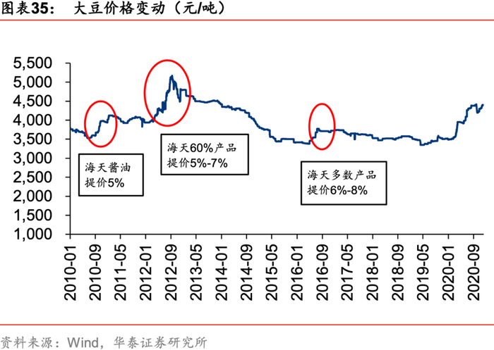 2020年原材料价格上行,大豆、包装物成本上涨压力较大,调味品或将步入涨价窗口期。从原材料价格走势来看,2020年下半年以来大豆价格始终处于高位上行趋势。从包装物价格走势来看,2020年3季度以来PVC及玻璃制品价格指数呈现上行趋势。调味品提价周期约为2-3年,2019年恒顺醋业、天味食品对部分产品进行提价,2020年榨菜缩减包装变相提价。综上,成本压力或将推动产调味品步入提价周期。