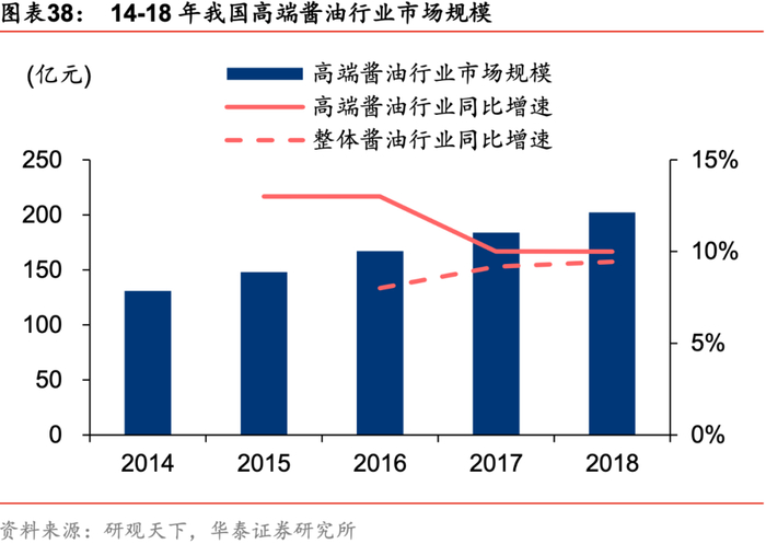 产品升级、结构高端化是传统品类增长主要驱动力。参考海外成熟市场美国和日本市场的经验,随着消费人群的年轻化、餐饮业的较快增长,调味品市场未来将呈现高端化发展态势。调味品的价格增长主要通过产品结构优化以及成本上涨驱动直接提价。以酱油为例,高鲜酱油、花色酱油、薄盐、零添加酱油等价格高于普通酱油,这类差异化高端产品增长快于酱油整体增长,我国高端酱油市场2018年行业市场规模突破200亿元,同比增长10%,16-18年高端酱油行业同比增速均高于整体酱油行业同比增速。