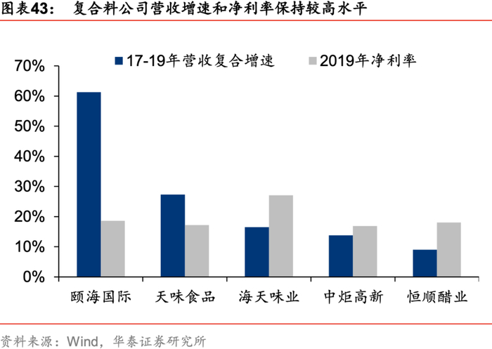 2)新兴品类:具备较大渗透率提升空间的复合调味料品类成长性较好,高端化和复合化将继续推动调味品行业增长。